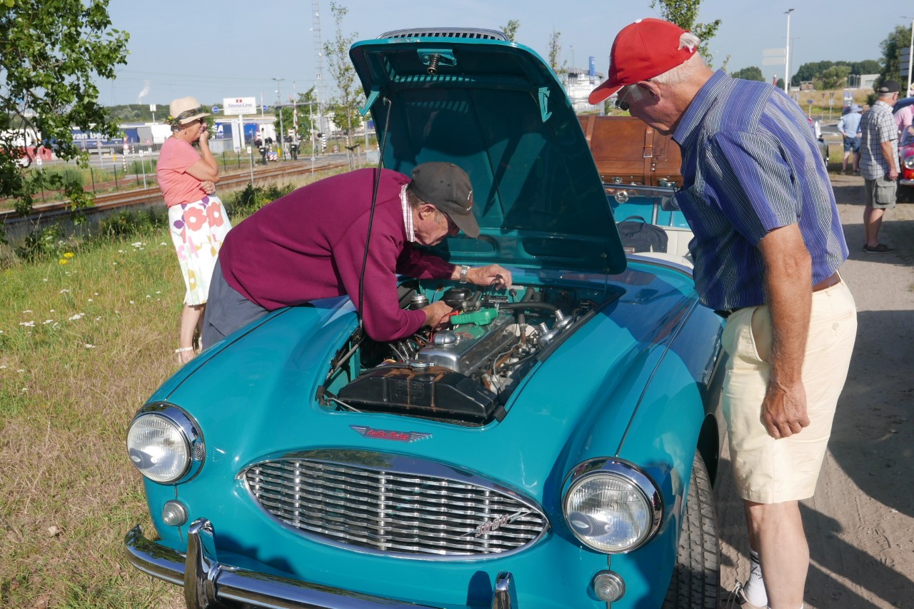 Jo and I decided to set out the day before our ferry crossing, to have a gentle drive to Essex to visit friends and stay overnight near to the port. The gentle drive became a drive from hell! As we approached the Dartford Crossing on the M25, (otherwise known as the London Orbital Carpark) the overhead motorway gantry sign warned of delays at the crossing. This turned out to be a 40-minute crawl between J2 and the crossing, in a temperature of 35° C, which as you are all aware, our Healeys do not like. We turned the engine on and off to keep the temperature down (thank goodness our BN6 has two whopping great batteries) just to move some 10 yards!!!! But we made it through the tunnel without overheating and safely to our hotel for the night. In my younger days (in the 1950s) I use to go to the pub next to the hotel on my motor bike to meet up with the local coffee bar cowboys and to roar down to Southend and back, no speed limits in those days!!!! How did we survive?